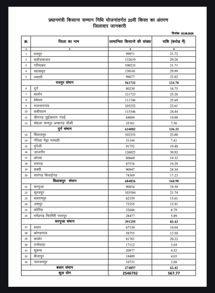 छत्तीसगढ़ प्रदेश में 25,47,538 किसानों को इस योजना का लाभ मिलेगा, जिनके खातों में करोड़ों रुपये सीधे अंतरित हुए। इसी क्रम में जिला सारंगढ़-बिलाईगढ़ के 74,369 किसानों को 17.23 करोड़ रुपये की राशि मिली। यह धनराशि किसानों के निजी खर्च, कृषि कार्यों एवं उत्पादन बढ़ाने में सहायक होगी।