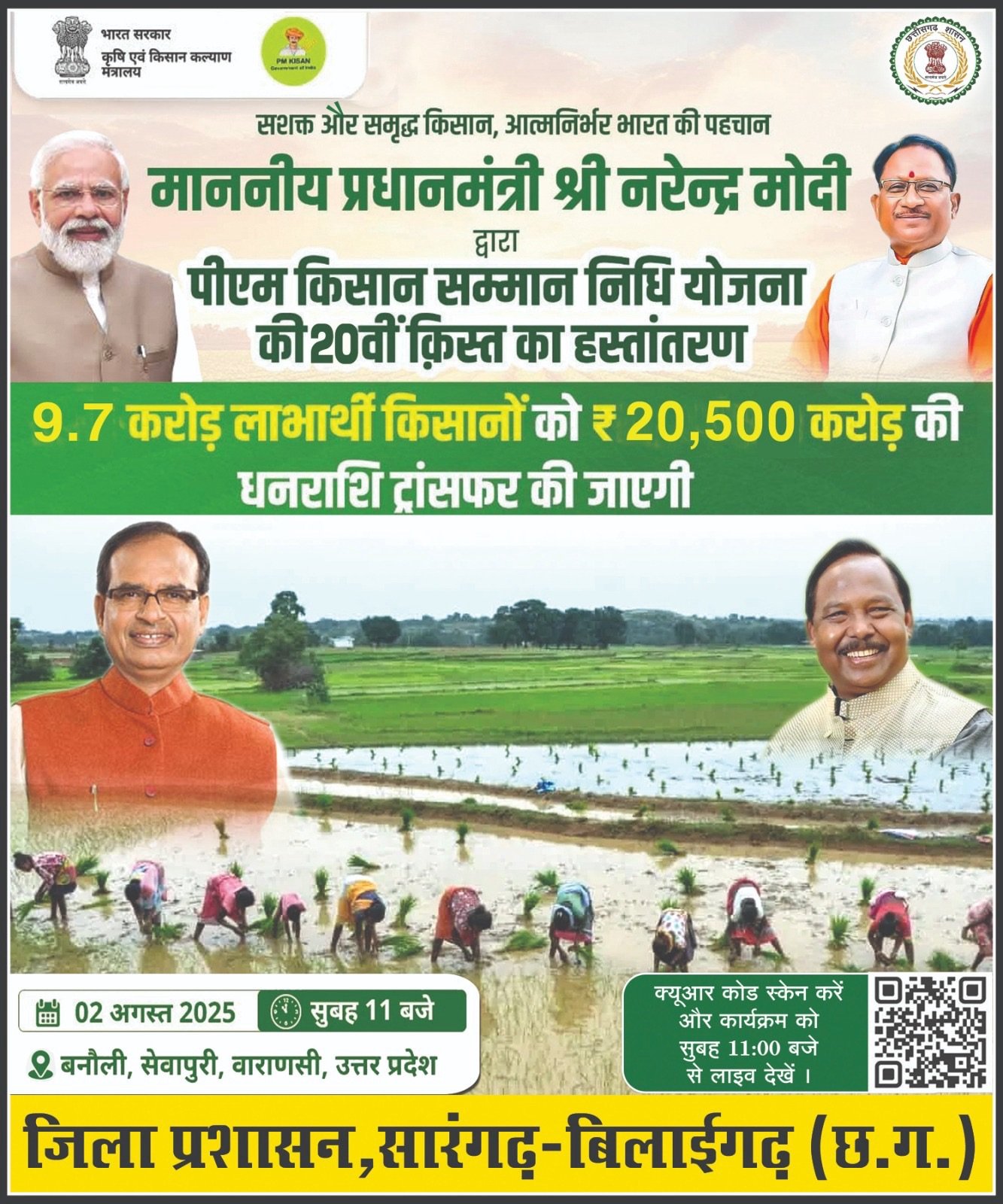 रायपुर/सारंगढ़-बिलाईगढ़, किसानों की खुशहाली के लिए आज का दिन ऐतिहासिक है। प्रधानमंत्री किसान सम्मान निधि योजना की 20वीं किस्त के तहत देशभर के 9.7 करोड़ किसानों को 20,500 करोड़ रुपये की राशि अंतरित की जा रही है। यह राशि प्रधानमंत्री नरेंद्र मोदी द्वारा आज सुबह 11:00 बजे बनौली, सेवापुरी, वाराणसी (उत्तर प्रदेश) से वर्चुअल कार्यक्रम के माध्यम से हस्तांतरित की गई।