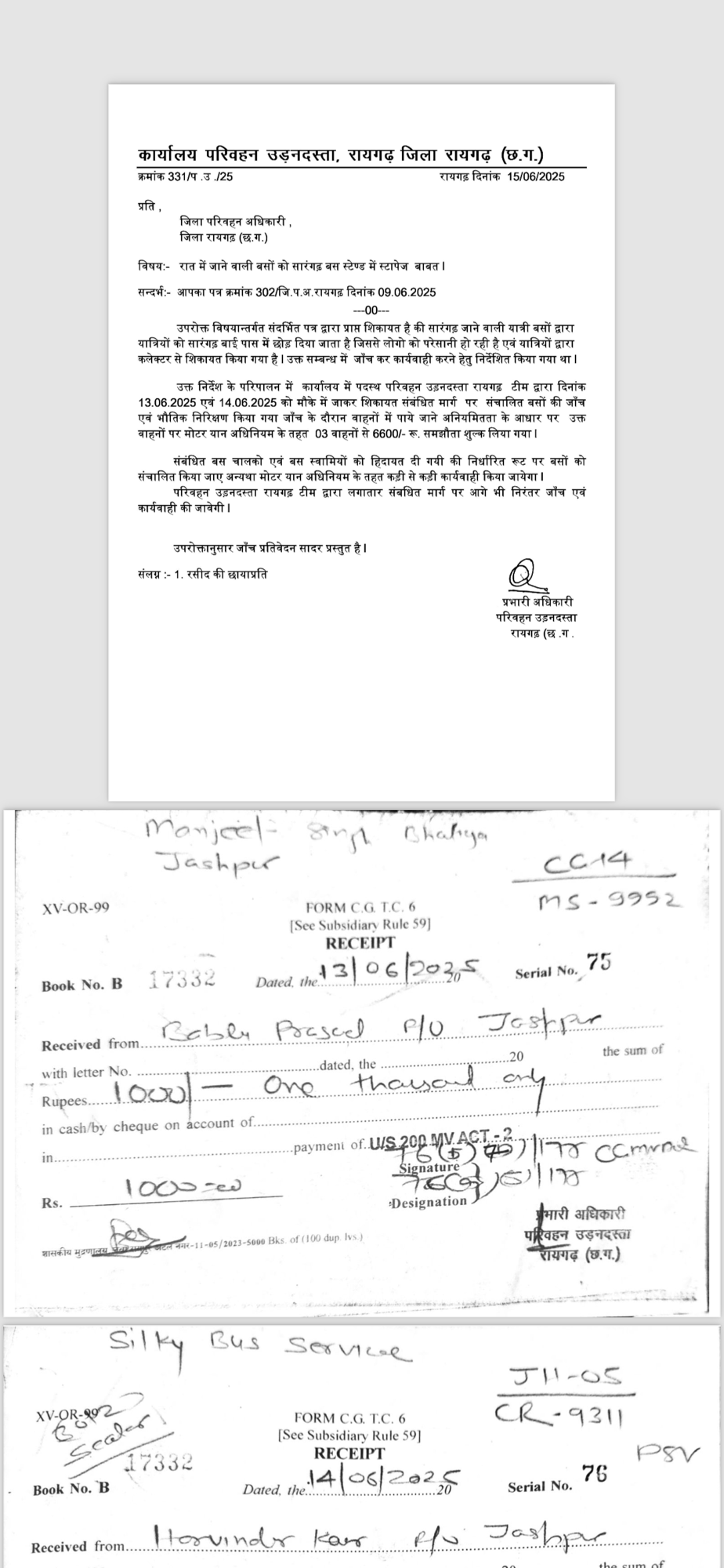 सारंगढ़-बिलाईगढ़ सारंगढ़ जाने वाली यात्री बसों द्वारा यात्रियों को सारंगढ़ बाई पास में छोड़ दिया जाता है, जिससे लोगो को परेशानी हो रही है एवं यात्रियों द्वारा कलेक्टर से शिकायत किया गया। इस सम्बन्ध में जॉच कर कार्यवाही करने हेतु निर्देशित किया गया था। निर्देश के परिपालन में कार्यालय में पदस्थ परिवहन उड़नदस्ता रायगढ़ टीम द्वारा 13 और 14 जून को मौके में जाकर शिकायत संबंधित मार्ग पर संचालित बसों की जाँच एवं भौतिक निरिक्षण किया गया जाँच के दौरान वाहनों में पाये जाने अनियमितता के आधार पर इन वाहनों पर मोटर यान अधिनियम के तहत 03 वाहनों से 6600/- रू. समझौता शुल्क लिया गया। संबंधित बस चालको एवं बस स्वामियों को हिदायत दी गयी कि निर्धारित रूट पर बसों को संचालित किया जाए अन्यथा मोटर यान अधिनियम के तहत कड़ी से कड़ी कार्यवाही किया जायेगा। परिवहन उड़नदस्ता रायगढ़ टीम द्वारा लगातार संबंधित मार्ग पर आगे भी निरंतर जाँच एवं कार्यवाही की जावेगी।