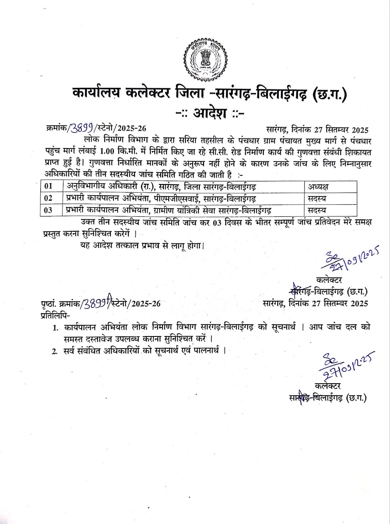 सारंगढ़-बिलाईगढ़ / सरिया तहसील के ग्राम पंचधार में मुख्य सड़क से ग्राम पहुंच तक 1 किलोमीटर में गुणवत्ताहीन सीसी रोड निर्माण की शिकायत पर कलेक्टर डॉ संजय कन्नौजे ने तीन सदस्यीय जांच टीम गठित किया है, जिसमें जांच अधिकारी एसडीएम वर्षा बंसल और निर्माण एजेंसी के अधिकारी होंगे। कलेक्टर ने एसडीएम को निर्देश दिए हैं कि वे तत्काल ग्राम पंचधार में जाकर सड़क की जांच रिपोर्ट तैयार कर प्रस्तुत करें।