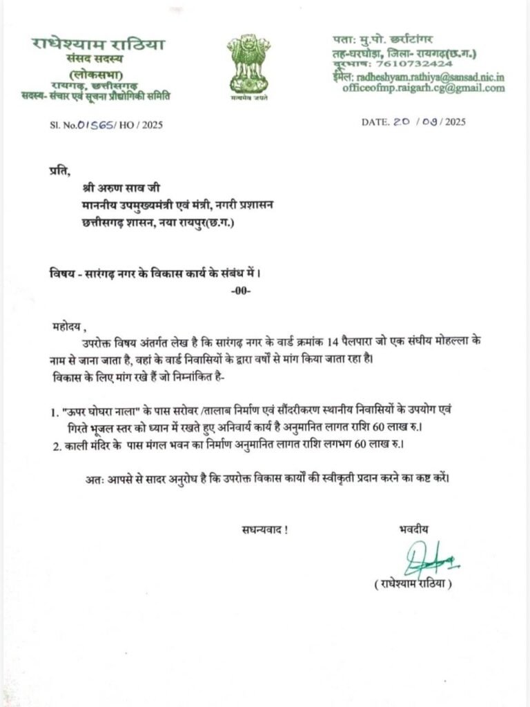 ज्ञात हो कि रायगढ़ लोक सभा क्षेत्र के सक्रिय और लोकप्रिय सांसद श्री राधेश्याम राठिया जी के सारंगढ़ प्रवास के दौरान भाजपा नेता दुर्गा प्रताप सिंह ठाकुर, प्रदेश मंत्री अजा मोर्चा हरिनाथ खूटे, युवा नेता प्रकाश अग्रवाल एवं सतीश शर्मा के द्वारा नगर में स्थित ऐतिहासिक घोघरा नाला के पास सरोवर निर्माण तथा काली मंदिर के पास मंगल भवन निर्माण के लिए मांग रखा था जिसपर सांसद के द्वारा तत्काल प्रदेश के यशस्वी उपमुख्यमंत्री अरुण साव को पत्र लिखा जिसे उनके विभाग के स्वीकृत किया गया है।