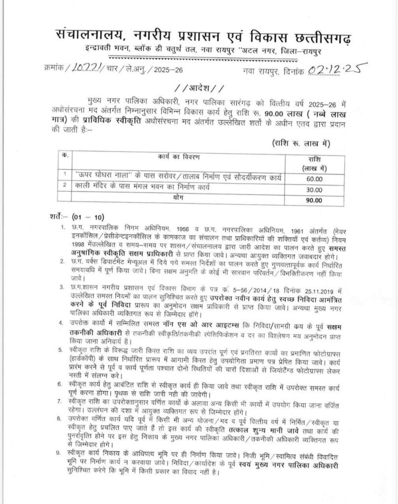 बता दे की नगरीय प्रशासन एवं विकास विभाग द्वारा जारी आदेश में दो निर्माण कार्य के लिए 90 लाख रुपये की स्वीकृति जारी की है।
