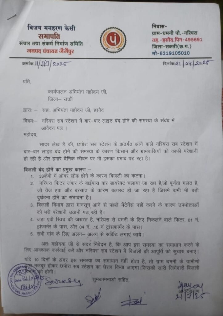नरियरा सब स्टेशन की बिजली कटौती से किसान सहित ग्रामीणों में आक्रोश का माहौल है जिसको लेकर हम लोगों ने बिजली की समस्या का निराकरण करने के लिए कार्यपालन अभियंता सक्ती को सहा. अभियंता के मध्यम से आवेदन दिए हैं अगर समस्या का समाधान नहीं होती है तो फिर आगे आंदोलन करेंगे।
