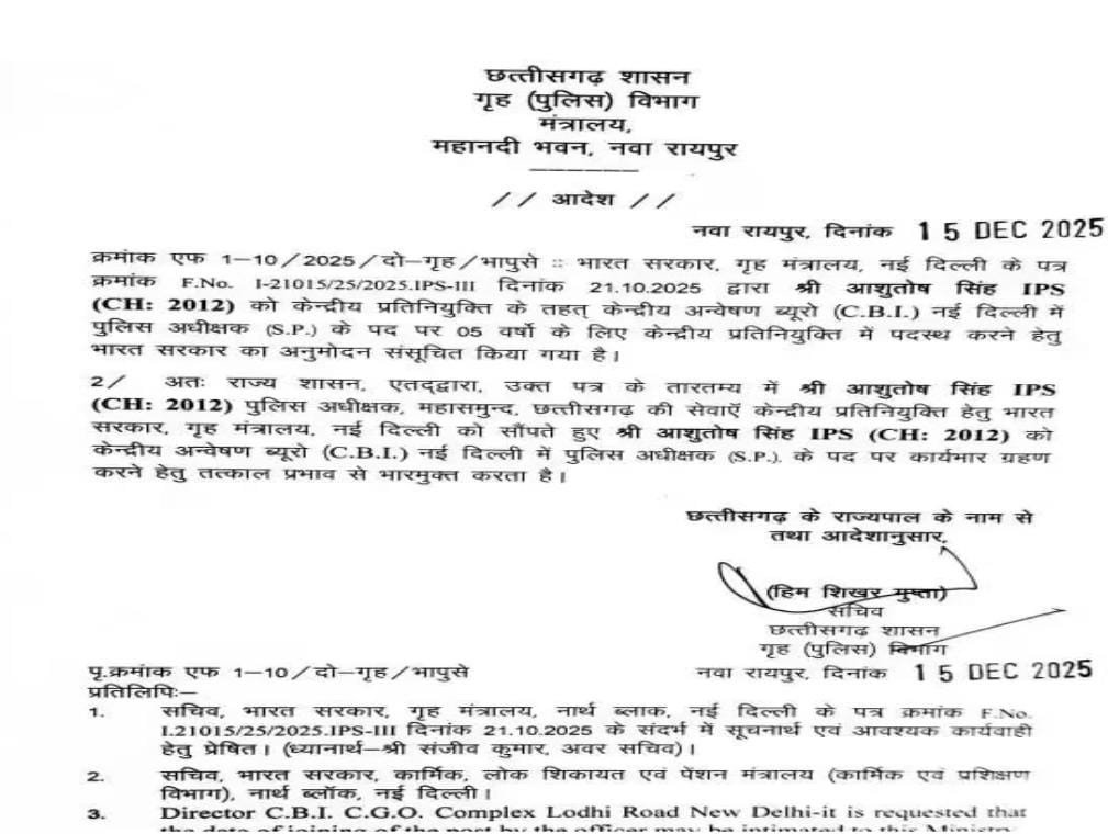 छत्तीसगढ़ कैडर के 2012 बैच के भारतीय पुलिस सेवा (आईपीएस) आशुतोष सिंह को डेपुटेशन पर सेंट्रल ब्यूरो ऑफ इनविगेस्टकेशन (सीबीआई) पुलिस अधीक्षक (एसपी) बनाया गया है। मिनिस्ट्री ऑफ़ होम अफेयर्स के अवर सचिव संजीव कुमार द्वारा इसका आदेश जारी किया गया है। जारी आदेश के अनुसार, सीबीआई में उनका कार्यकाल ज्वाइन करने के बाद 5 साल या आगामी आदेश ( जो भी पहले हो) तक होगा।