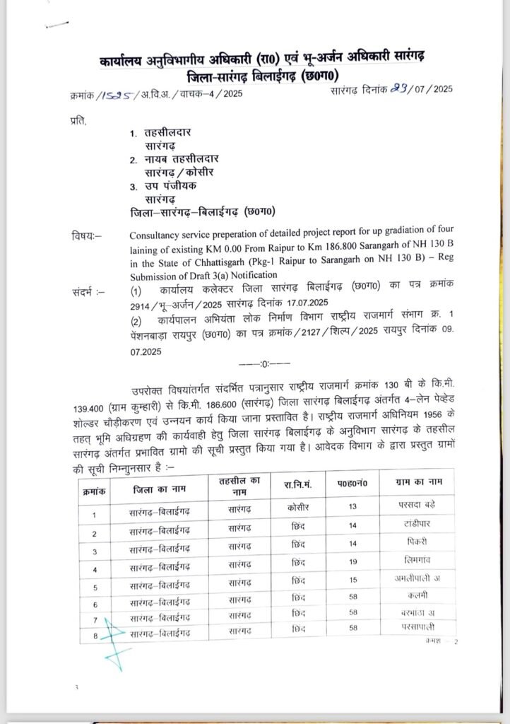 कलेक्टर कार्यालय सारंगढ़-बिलाईगढ़ द्वारा जारी आदेश क्रमांक 2914/भू-अर्जन/2025 दिनांक 17.07.2025 के अनुसार, यह फोरलेन निर्माण कार्य किमी 139.400 (कुहारी) से लेकर किमी 186.600 (सारंगढ़) तक प्रस्तावित है। इसके तहत ज़िले की तहसील सारंगढ़ के अंतर्गत कुल 30 गांवों की भूमि प्रभावित होगी।