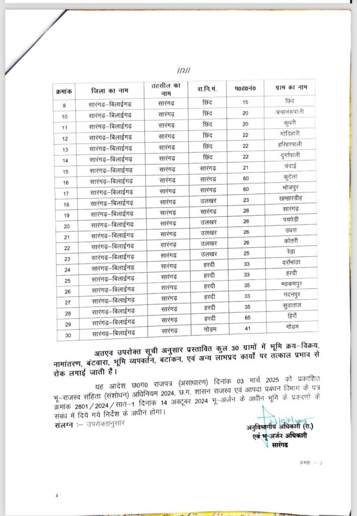 प्रशासन द्वारा जारी आदेश के अनुसार इन सभी गांवों में भूमि क्रय-विक्रय, नामांतरण, विभाजन, भू-ऋण, नक़्शा पास करना या किसी भी प्रकार का लाभ प्राप्त करने संबंधी कार्यों पर तत्काल प्रभाव से रोक लगा दी गई है।