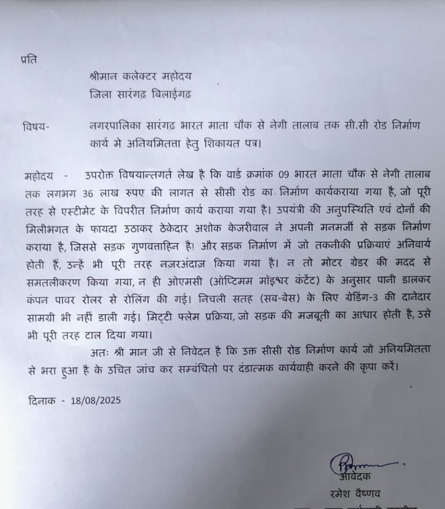 सारंगढ़ बिलाईगढ़ – शिकायत के अनुसार / नगरपालिका सारंगढ़ वार्ड क्रमांक 09 भारत माता चौक से नेगी तालाब तक लगभग 36 लाख रुपए की लागत से सीसी रोड का निर्माण कार्यकराया गया है, जो पूरी तरह से एस्टीमेट के विपरीत निर्माण कार्य कराया गया है। उपयंत्री की अनुपस्थिति एवं उपयंत्री और ठेकेदार दोनों की मिलीभगत के फायदा उठाकर ठेकेदार अशोक केजरीवाल ने अपनी मनमर्जी से सड़क निर्माण कराया है, जिससे सड़क गुणवत्ताहिन है। और सड़क निर्माण में जो तकनीकी प्रक्रियाएं अनिवार्य होती हैं, उन्हें भी पूरी तरह नज़रअंदाज किया गया है। न तो मोटर ग्रेडर की मदद से समतलीकरण किया गया, न ही ओएमसी (ऑप्टिमम मॉइश्चर कंटेंट) के अनुसार पानी डालकर कंपन पावर रोलर से रोलिंग की गई। निचली सतह (सब-बेस) के लिए ग्रेडिंग-3 की दानेदार सामग्री भी नहीं डाली गई। मिट्टी फ्लेम प्रक्रिया, जो सड़क की मजबूती का आधार होती है, उसे भी पूरी तरह टाल दिया गया है।