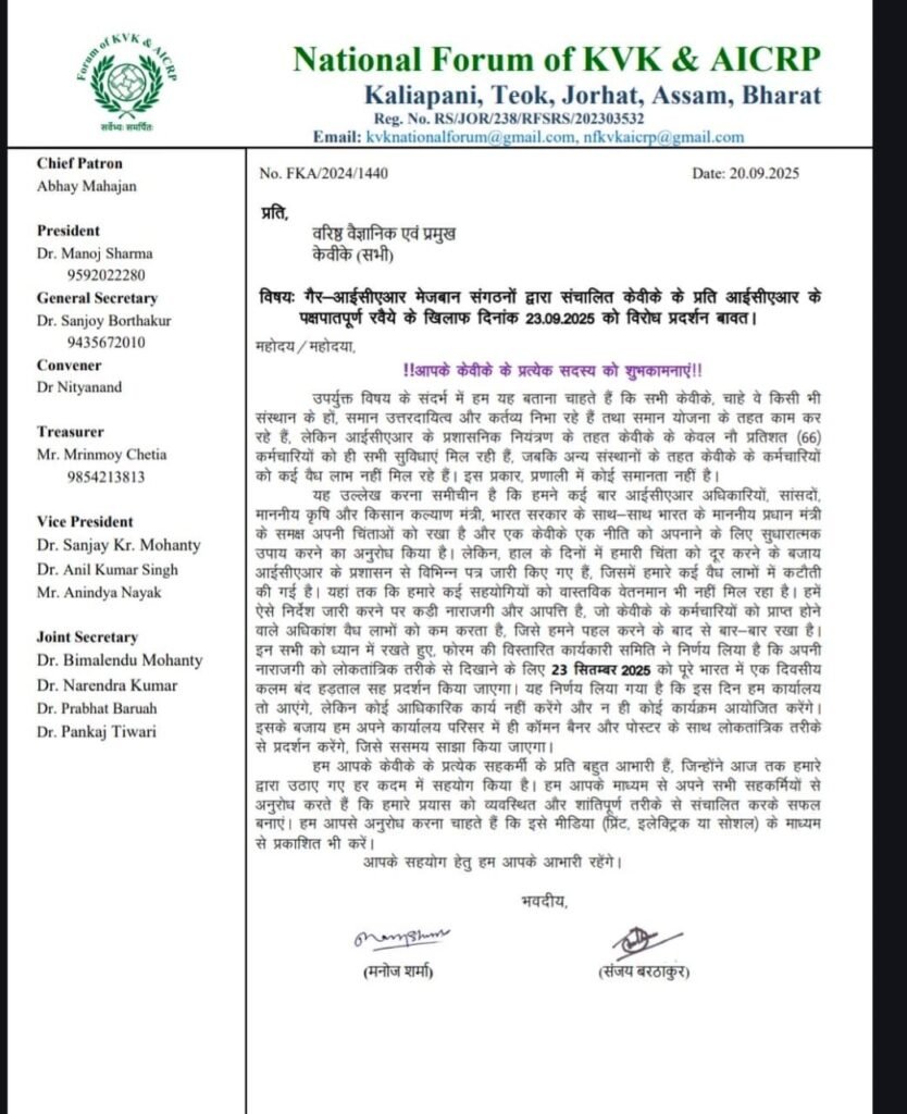 हम आईसीएआर के अधीन काम करने वाले अपने सहयोगियों के समान ही जिम्मेदारियाँ निभाते हैं, लेकिन वेतन, पदोन्नति, भत्तों और सेवानिवृत्ति लाभों में हमें लगातार दोयम दर्जे का व्यवहार झेलना पड़ रहा है। यह अन्यायपूर्ण है और इसे तुरंत समाप्त किया जाना चाहिए।" उल्लेखनीय है कि देश के 91% केवीके आईसीएआर के अलावा राज्य कृषि विश्वविद्यालयों, एनजीओ और राज्य सरकारों द्वारा संचालित हैं। फोरम का आरोप है कि आईसीएआर द्वारा गैर-आईसीएआर केवीके के कर्मचारियों के साथ व्यवस्थित भेदभाव किया जा रहा है, जो संवैधानिक अधिकारों का उल्लंघन है। केवीके भाटापारा के कर्मचारियों ने फोरम के निर्णय का पूर्ण समर्थन करते हुए चेतावनी दी है कि यदि उनकी माँगों पर शीघ्र ध्यान नहीं दिया गया, तो वे आगामी VKSA (रबी) अभियान (3-18 अक्टूबर 2025) का पूर्ण बहिष्कार करेंगे। उन्होंने आईसीएआर और केंद्र सरकार से तत्काल हस्तक्षेप करके परोदा समिति की सिफारिशों को लागू करने और सभी केवीके कर्मचारियों के लिए एकसमान नीति सुनिश्चित करने की माँग की है। इस आंदोलन का उद्देश्य केवल कर्मचारियों के हितों की रक्षा करना ही नहीं, बल्कि केवीके प्रणाली की दक्षता बनाए रखना भी है, ताकि किसानों को निर्बाध रूप से बेहतर सेवाएं मिलती रहें।