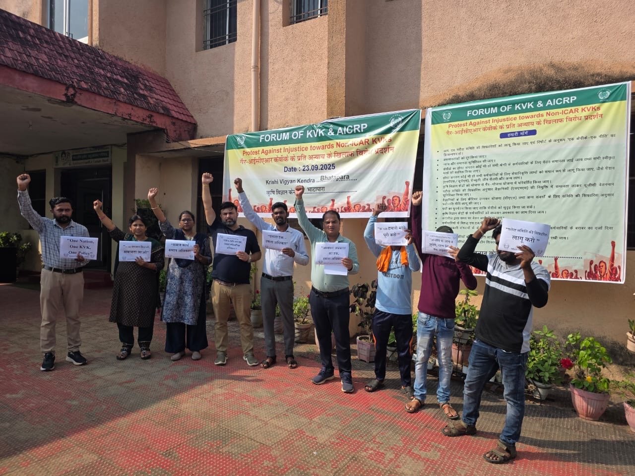 भाटापारा, फोरम ऑफ केवीके एंड एआईसीआरपी के राष्ट्रव्यापी आह्वान के अनुरूप, इन्दिरा गांधी कृषि विश्वविद्यालय के प्रशासनिक नियंत्रण मे कार्यरत कृषि विज्ञान केंद्र (केवीके), भाटापारा के अधिकारी/ कर्मचारियों ने आज "कलम बंद हड़ताल" एवं प्रदर्शन कार्यक्रम का आयोजन किया। यह आंदोलन भारतीय कृषि अनुसंधान परिषद (आईसीएआर) की भेदभावपूर्ण नीतियों के विरोध में और "वन नेशन, वन केवीके, वन पॉलिसी" की माँग को लेकर किया गया। केवीके भाटापारा के कर्मचारियों ने सुबह 10 बजे से शाम 5 बजे तक केंद्र पर ही एकत्रित होकर विरोध-प्रदर्शन किया। उन्होंने तैयार किए गए बैनर और प्लेकार्ड्स के माध्यम से अपनी माँगों को रखा और "हमें चाहिए न्याय", "वन नेशन-वन केवीके-वन पॉलिसी" जैसे नारों के साथ आईसीएआर की भेदभावपूर्ण रवैये के खिलाफ आवाज़ बुलंद की। केवीके भाटापारा के प्रतिनिधि ने बताया कि यह विरोध केवल वेतन की बात नहीं, बल्कि सम्मान और समान अधिकारों की लड़ाई है।