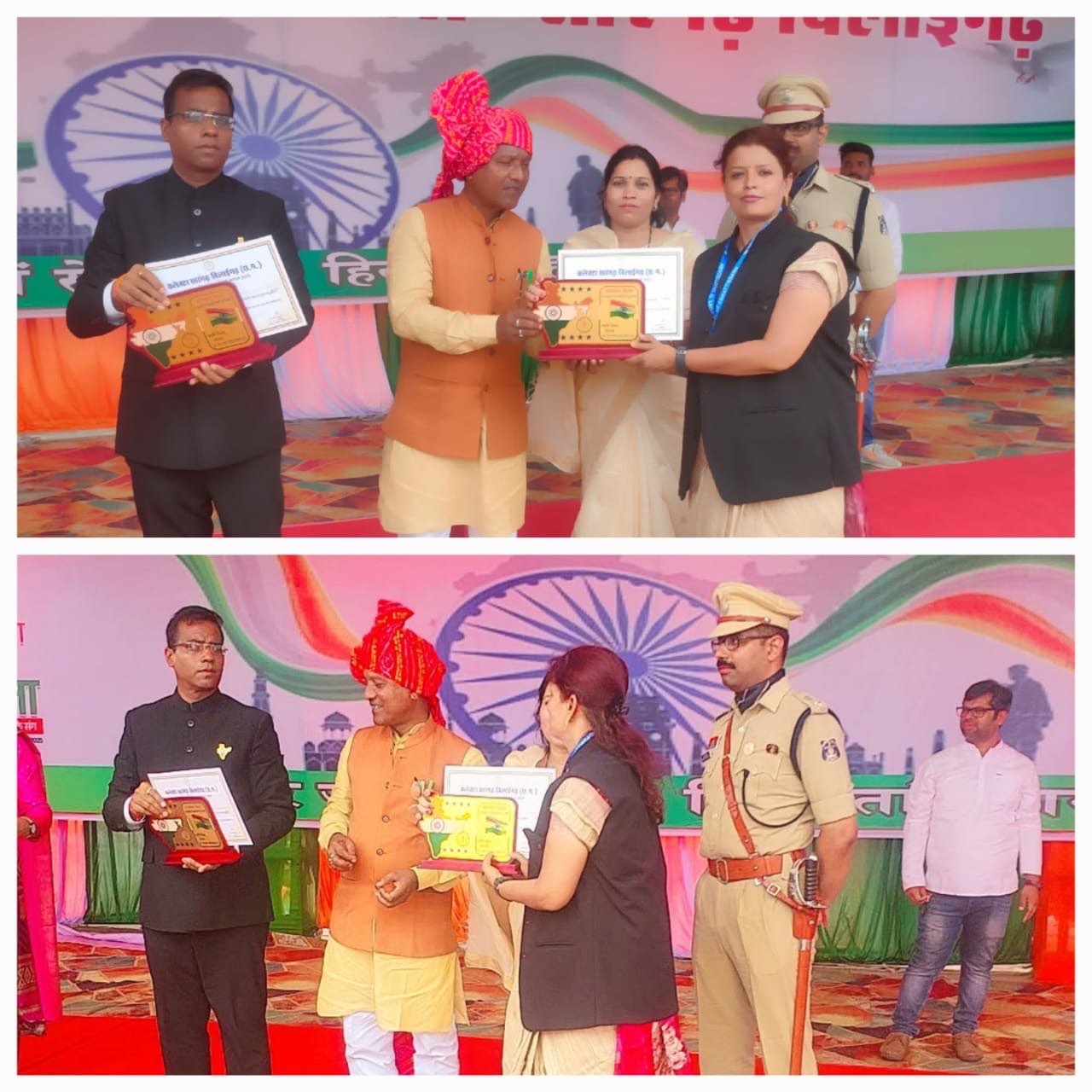 सारंगढ़ बिलाईगढ़ जिले के ब्राह्मण महिला तदर्थ समिति की सचिव श्रीमती अंजू तिवारी, शिक्षक, शासकीय पूर्व माध्यमिक शाला बिरसिंगडीह आज स्वतंत्रता दिवस के शुभ अवसर पर आदरणीय सांसद, एवं कलेक्टर महोदय के हाथों सम्मानित हुई।।।