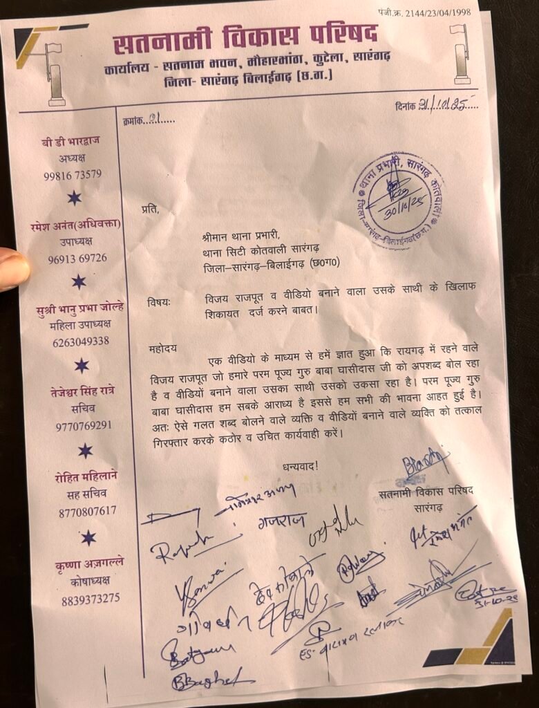 शिकायत में कहा गया है कि वीडियो में विजय राजपूत ने बाबा घासीदास जी के प्रति अपशब्दों का प्रयोग किया है तथा वीडियो बनाने वाला उसका साथी उसे उकसा रहा है। इस तरह की हरकत न केवल धार्मिक आस्था का अपमान है बल्कि समाज की एकता व सद्भावना को भी ठेस पहुँचाने वाली है।