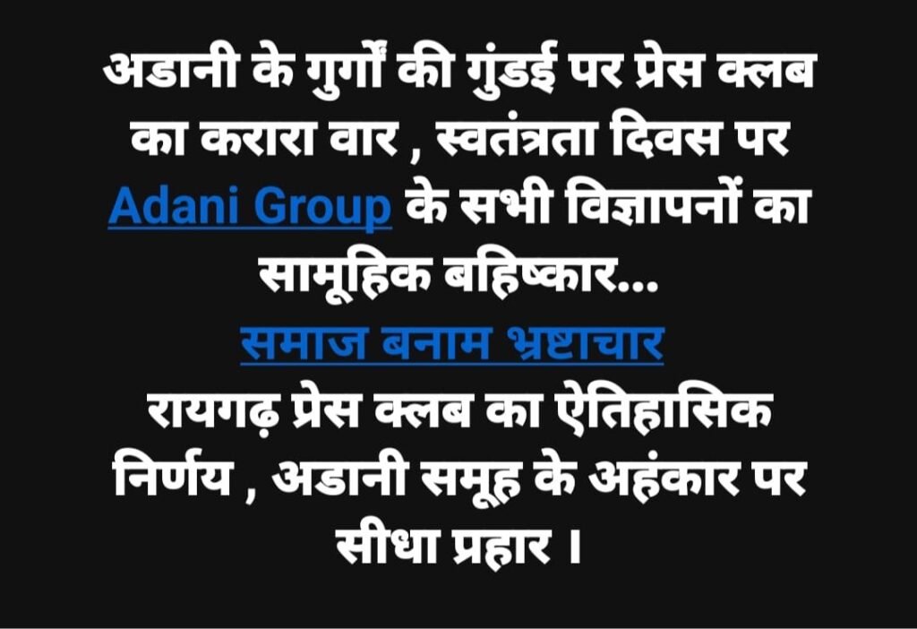 अब रायगढ़ जिले सहित पूरा छत्तीसगढ़ इस ऐतिहासिक बहिष्कार के असर को देखने के लिए तैयार है, जहां मीडिया अपनी कलम को हथियार बनाकर अडानी के रसूख और दबदबे को चुनौती दे रहे हैं।