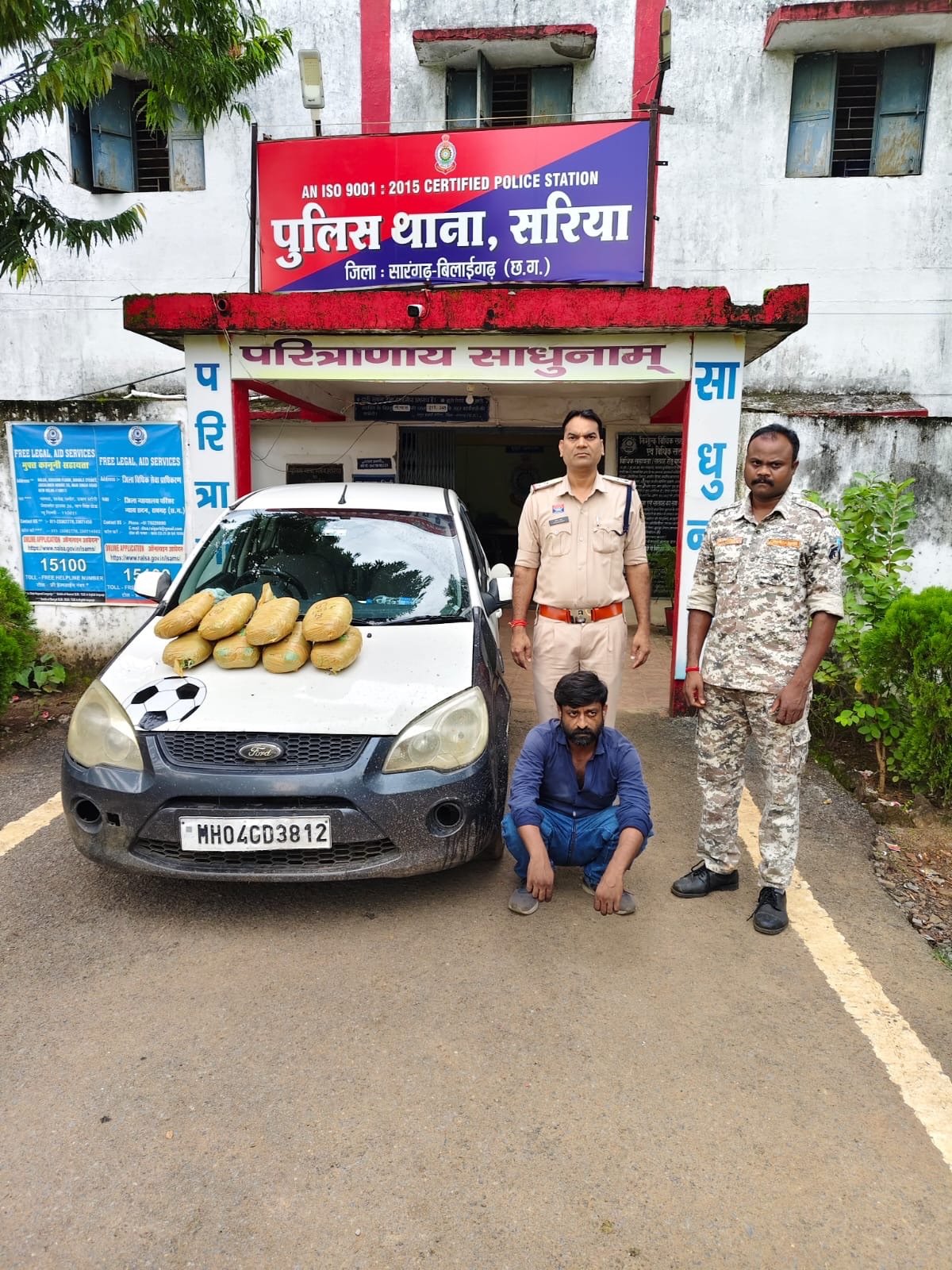 विवरण इस प्रकार है कि आज दिनांक 04/10/2025 को दौरान पेट्रोलिंग जरिये मुखबीर सुचना मिला एक सफेद रंग के कार क्रमांक MH 04 GD 3812 का चालक उड़ीसा से गांजा लेकर सरिया तरफ आ रहा है सूचना पर थाना के सामने मेन रोड सामुदायिक भवन के पास घेराबंदी कर फोर्ड क्लासिक कार क्रमांक MH 04 GD 3812 को रोककर तलाशी लेने पर कार के अंदर गुप्त चेंबर में 08 किलो 335 ग्राम अवैध मादक पदार्थ मिला। चालक से पूछताछ करने पर जिला बौद्ध उड़ीसा से गांजा खरीद कर देवास मध्य प्रदेश ले जाना बताया कि आरोपी कार चालक गोविंद सिंह पिता हरिराम सा गौरव नगर देवास मध्य प्रदेश के कब्जे से 08 किलो 335 ग्राम अवैध मादक पदार्थ गांजा कीमती 85000रु,एक नग मोबाईल कीमती 15000रु, सफेद रंग की फोर्ड क्लासिक कार क्रमांक MH 04 GD 3812 कीमती 200000 रु, जुमला कीमती 300000रु को जप्त कर आरोपी के खिलाफ थाना सरिया मे अपराध क्रमांक 228/2025 धारा 20 बी एनडीपीएस एक्ट पंजीबद्ध कर आरोपी को न्यायिक रिमांड पर जेल भेजा गया है।