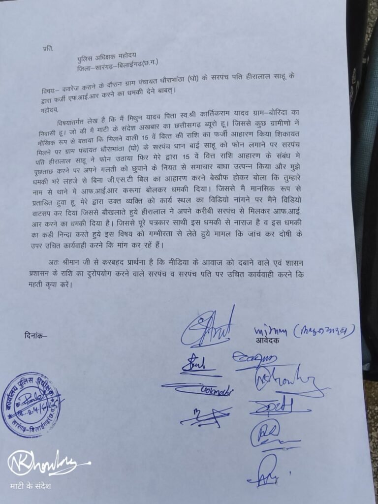 सूत्रों के अनुसार धौराभाठा पंचायत में 15वें वित्त आयोग की राशि में अनियमितता, बिना जीएसटी बिल के भुगतान जैसे मामलों की कवरेज करने पहुंचे पत्रकार मिथुन को सरपंच पति ने रिपोर्टिंग से रोकने का प्रयास किया। उनका कहना था कि यह खबर उजागर करने पर एफआईआर दर्ज करा दी जाएगी।