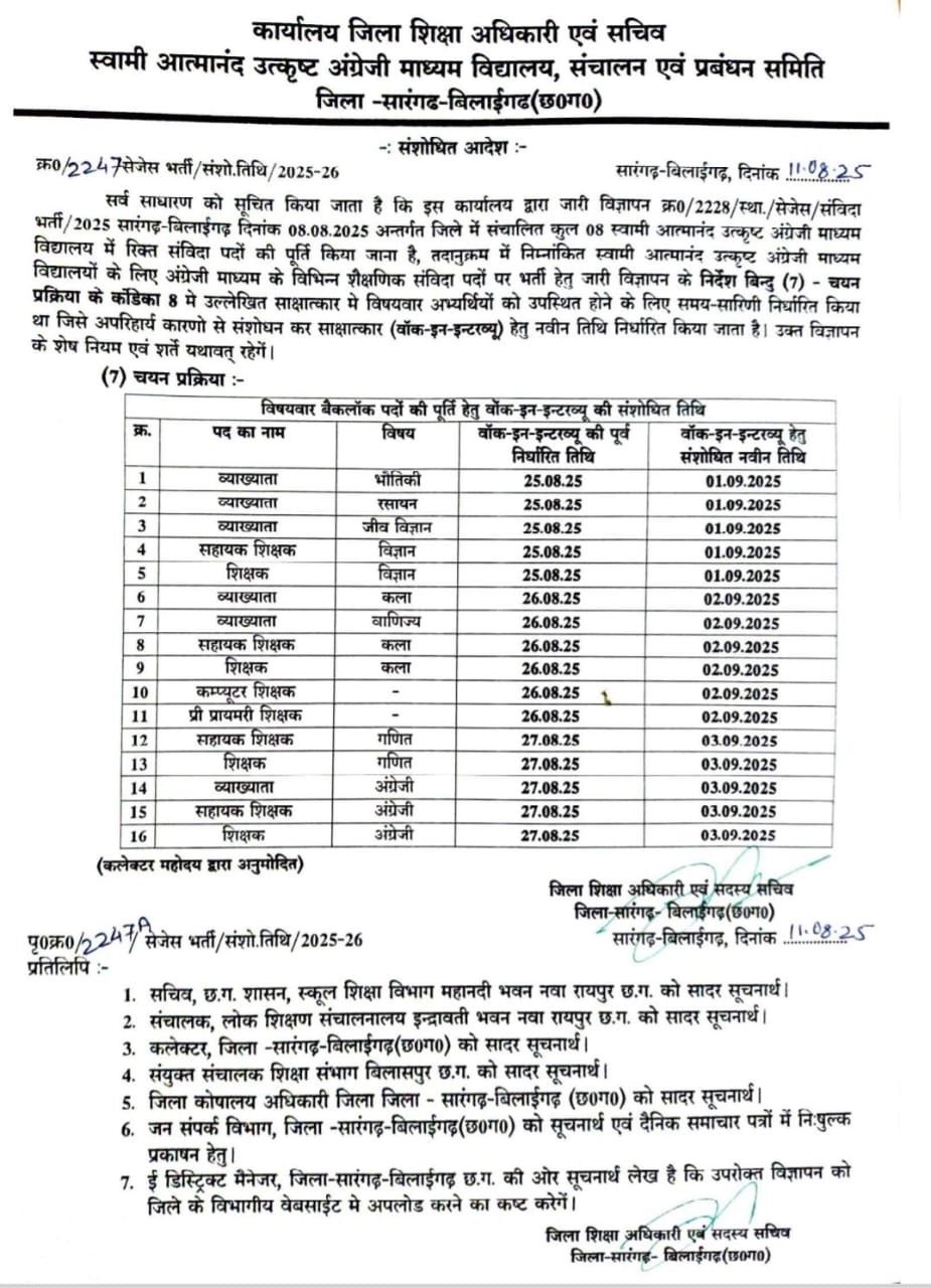 सारंगढ़ बिलाईगढ़, कार्यालय जिला शिक्षा अधिकारी एवं सचिव स्वामी आत्मानंद उत्कृष्ट अंग्रेजी माध्यम विद्यालय संचालन एवं प्रबंधन समिति जिला सारंगढ़ बिलाईगढ़ द्वारा वॉक इन इंटरव्यू के माध्यम से 36 पदों के लिए संविदा भर्ती विज्ञापन जारी किया गया है, जिसके तिथि में संशोधन किया गया है। यह जिले की वेबसाइट सारंगढ़ बिलाईगढ़ डॉट सीजी डॉट जीओवी डॉट इन पर उपलब्ध है। वॉक इन इंटरव्यू 25, 26 अगस्त और 27 अगस्त 2025 के स्थान पर अब संशोधित तिथि 1, 2 और 3 सितंबर निर्धारित है।