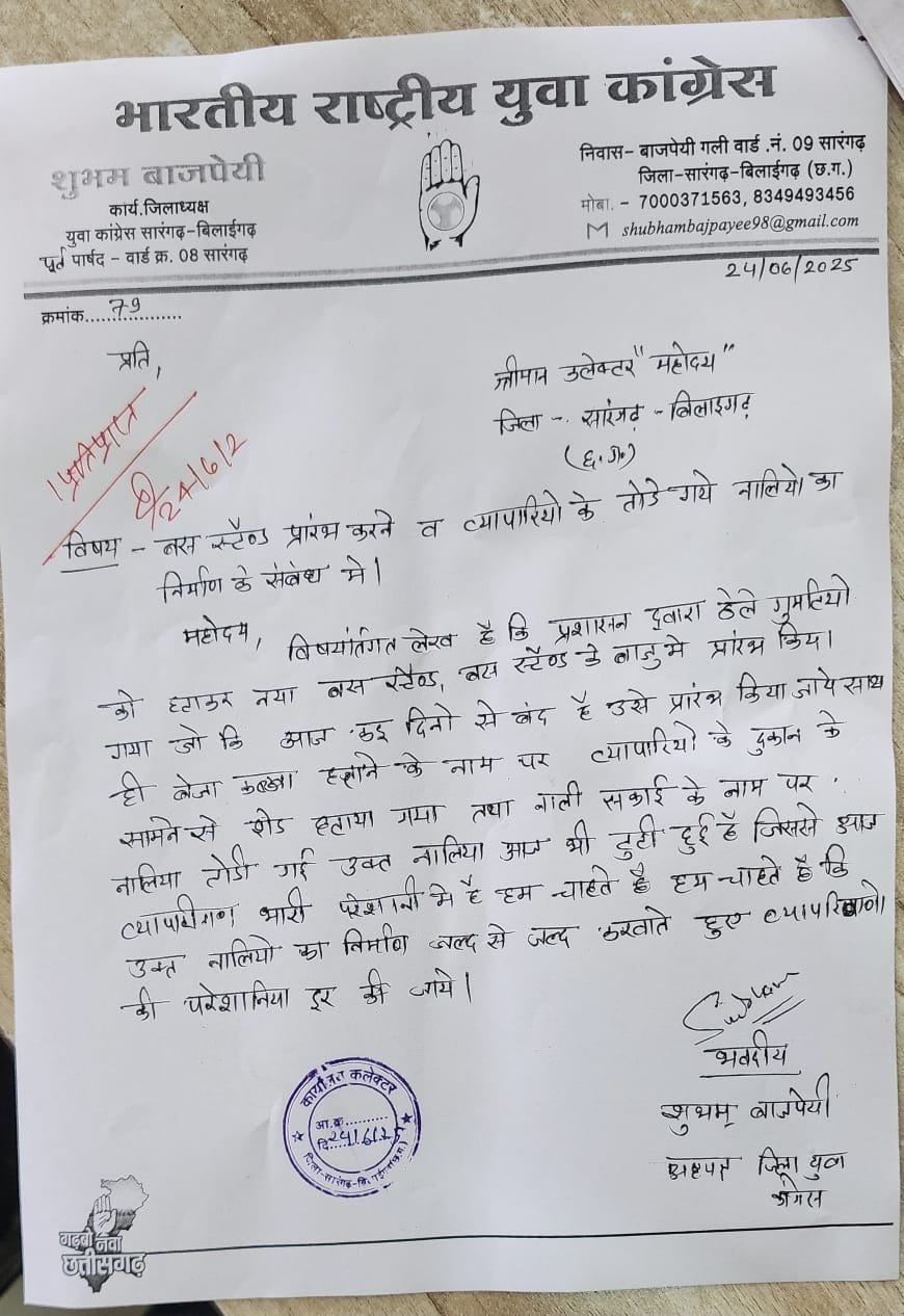 ज्ञापन में सारंगढ़ के नए बस स्टैंड को अतिशीघ्र चालू किए जाने की भी मांग की गई है। उन्होंने कहा कि लंबे समय से तैयार बस स्टैंड उपयोग में नहीं लाया जा रहा है, जिससे यात्रियों को असुविधा हो रही है और पुराने बस स्टैंड क्षेत्र में यातायात अव्यवस्थित हो गया है।